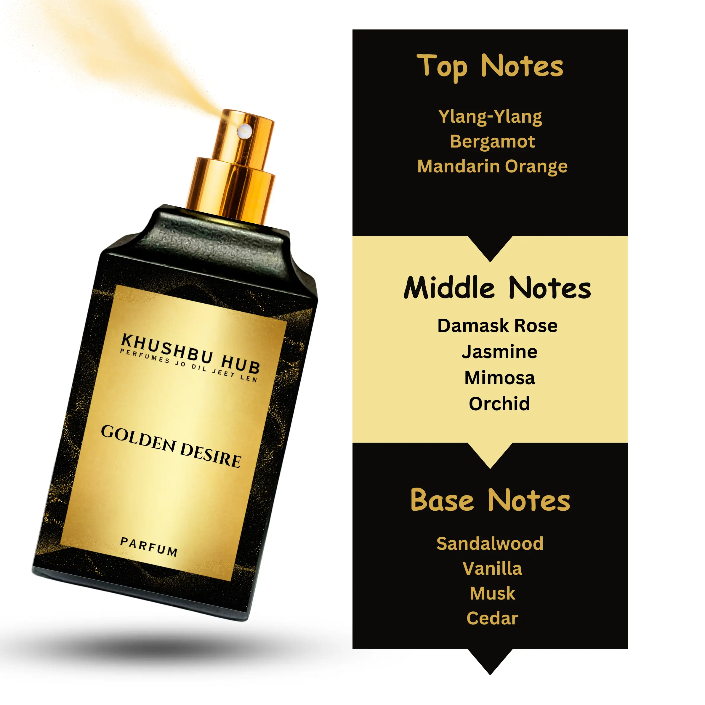 GOLDEN DESIRE is elegantly housed in a 50ml bottle, offering convenience without compromising on luxury. Its compact size makes it ideal for carrying in your bag or showcasing on your vanity, while the fragrance ensures you stay radiant throughout the day.